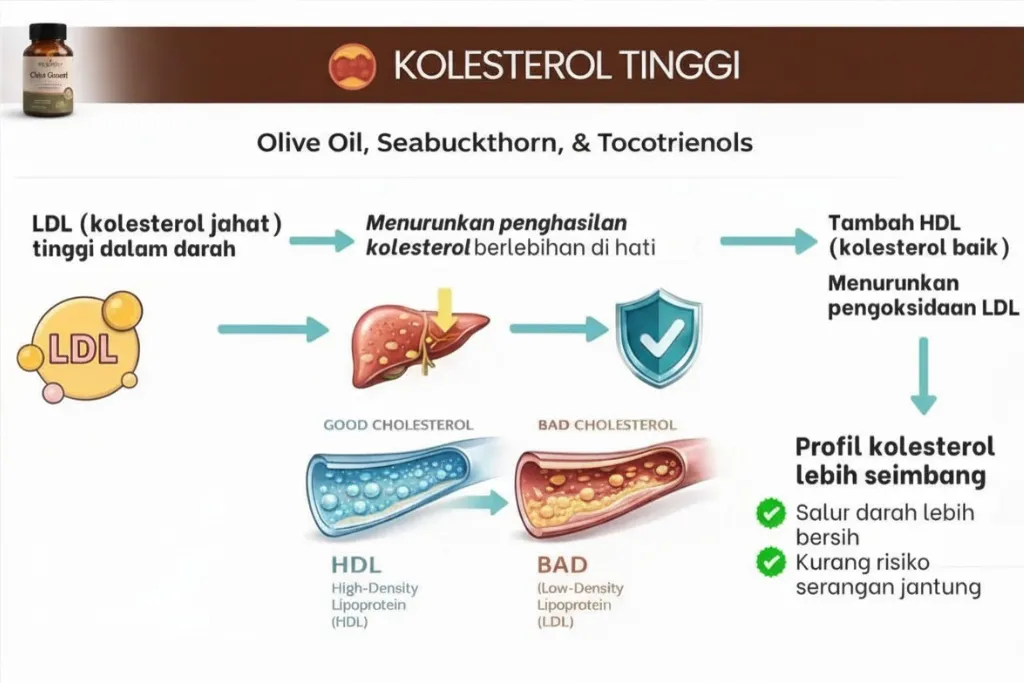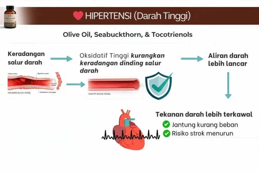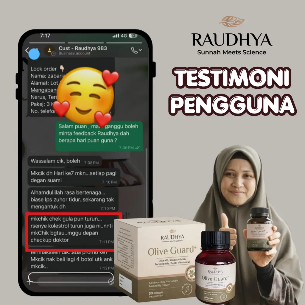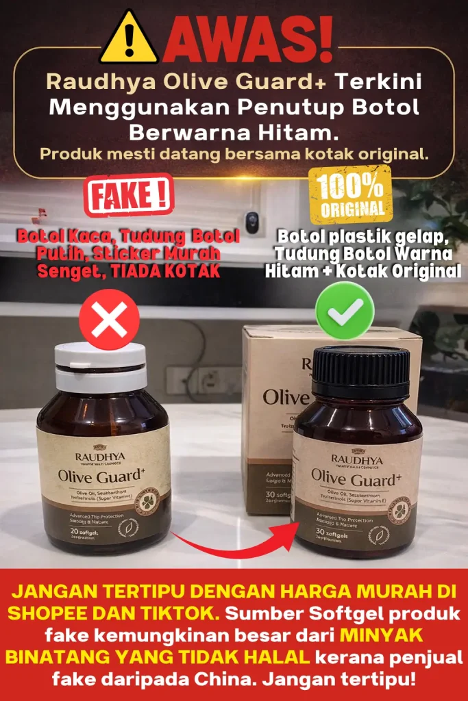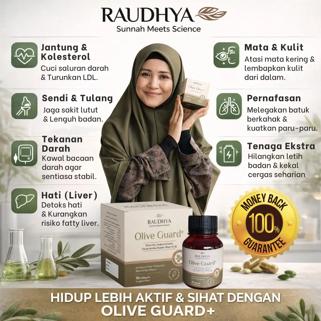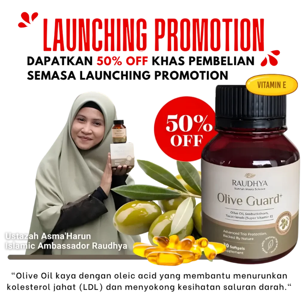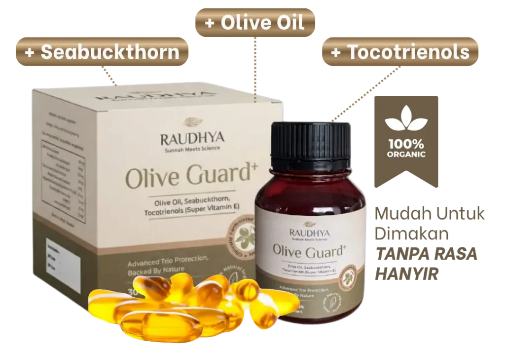 Raudhya OliveGuard+ Diperkaya Bahan Aktif Polyphenols, Tocotrienols (Super Vitamin E) & Omega Aktif Menyokong Kawalan Gula, Kolesterol & Tekanan Darah