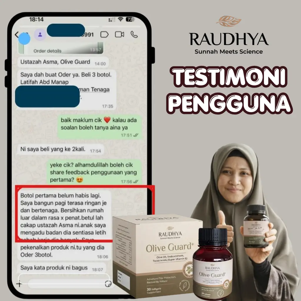 "Dalam Berjuang Dengan Urusan Dakwah Amat Penting Untuk Ustazah Sentiasa Sihat Bertenaga. Sebab Itu Beliau Amalkan Olive Guard+ Raudhya"
